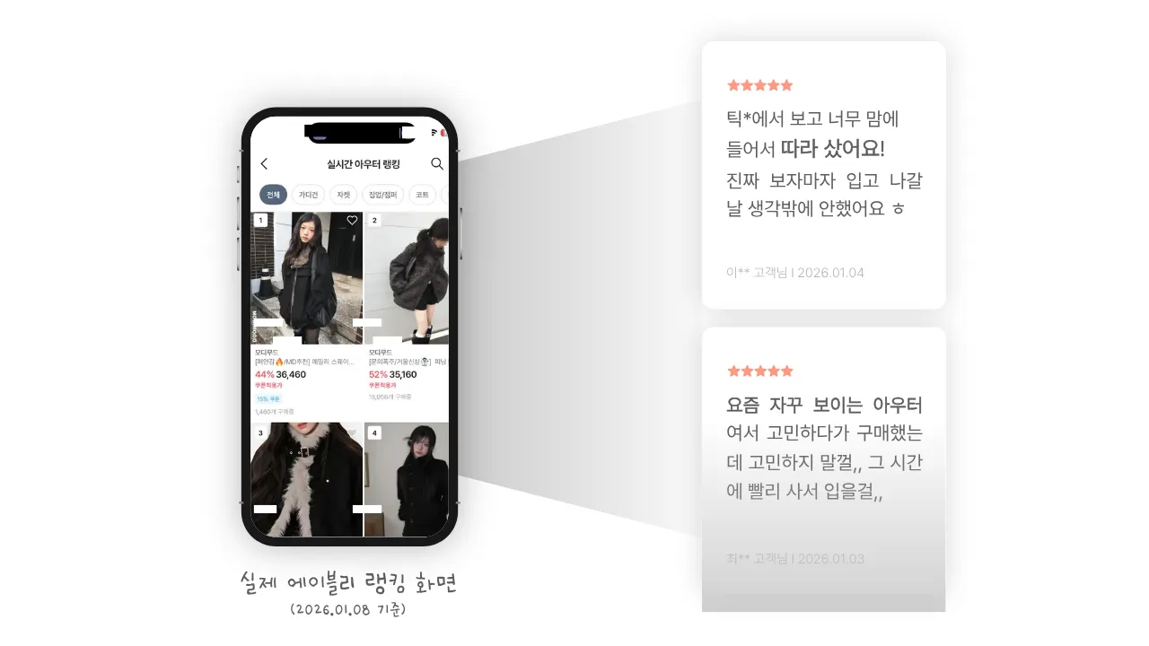 실제로 최근 일주일 동안 하프 기장 + 퍼 안감 아우터는 에이블리 아우터 랭킹 상위권을 차지하고 있고, 리뷰에서도 ‘따라 산 아이템’, ‘유행 아이템’이라는 반응이 다수 확인되고 있어요.