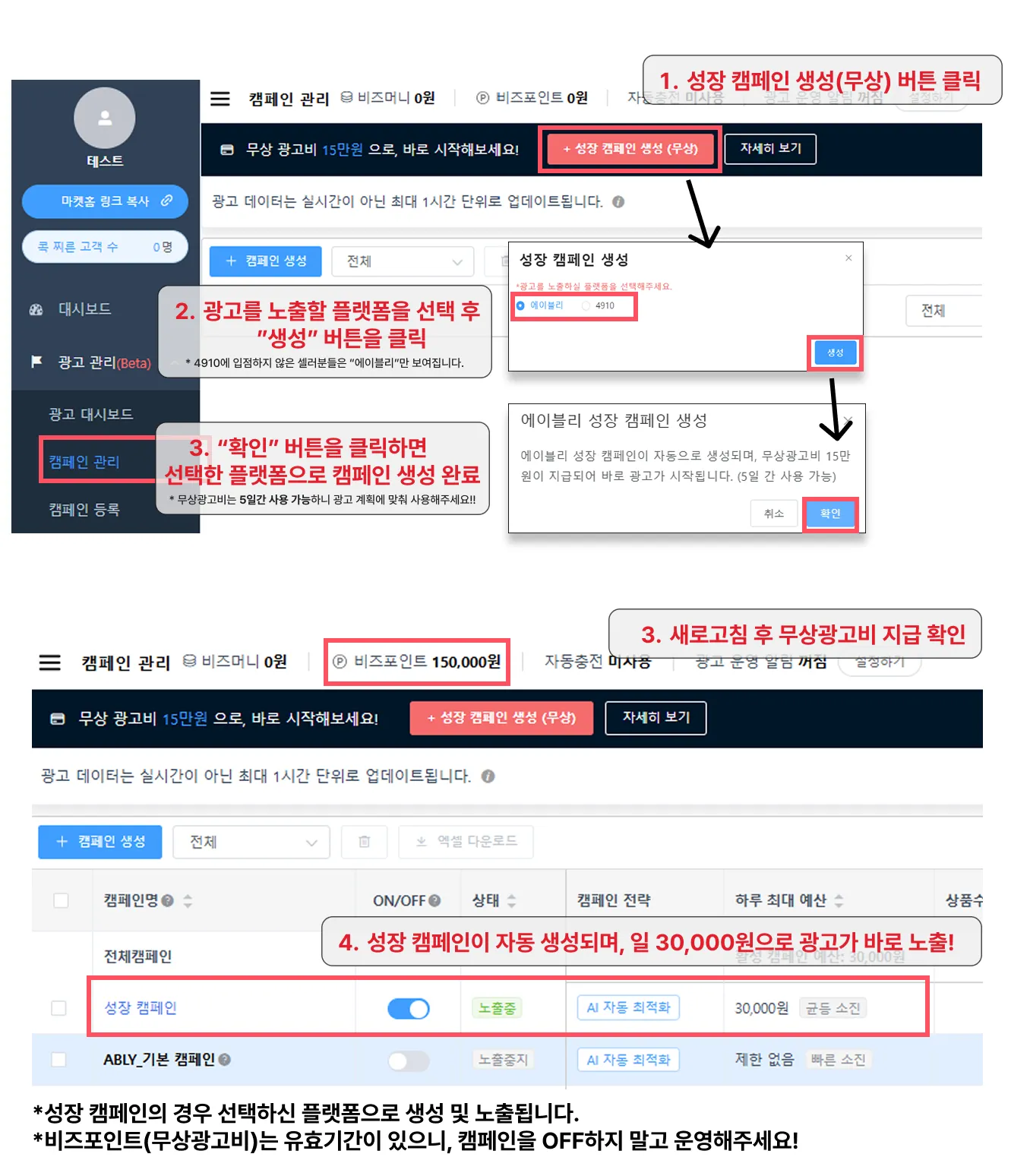 캠페인 생성 시 비즈포인트가 바로 지급되며, 지급일 다음날부터 5일까지만 사용할 수 있습니다.