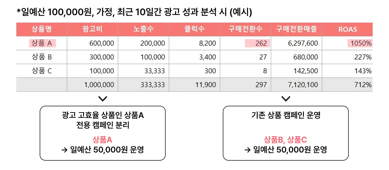 광고 효율이 잘 나오고 있는 상품만, 별도의 캠페인을 생성하여, 예산을 따로 할당하고 집중 노출될 수 있도록 관리해주세요!