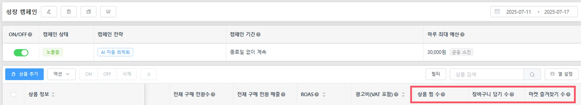 구매 전환이 아닌 찜, 장바구니, 마켓찜 등의 보조지표를 활용해보세요! 캠페인 상세 데이터 중 가장 오른쪽에 광고로 인해 발생한 상품 찜 수, 장바구니 담기 수, 마켓 즐겨찾기 수를 확인하실 수 있습니다.