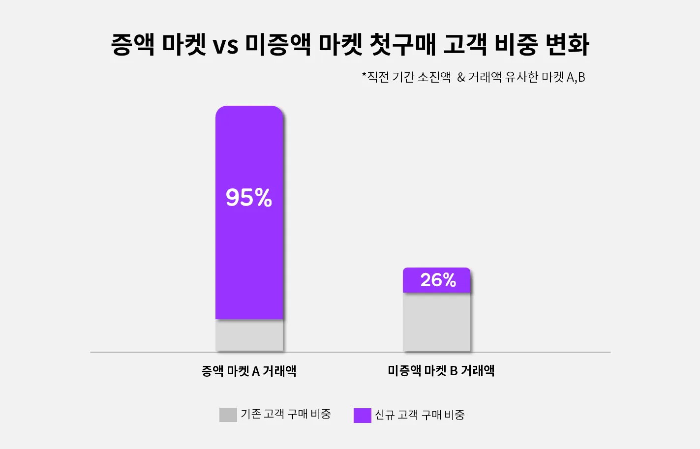 반면 광고비를 늘리지 않은 마켓 B는 신규 고객에게 상품을 많이 노출 시키지 못해 노출 적기를 놓쳤고, 이에 신규 고객 구매 비중과 거래액이 크게 늘지 못한 결과를 보였습니다.