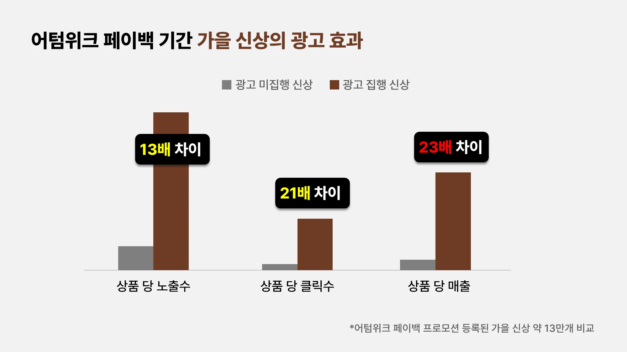 페이백 프로모션 기간 광고 운영한 신상품을 가을 매출을 견인하는 주력 상품으로 만들기 위해서는 프로모션 종료 이후에도 광고 노출량을 꾸준히 늘려주시는 게 중요합니다.