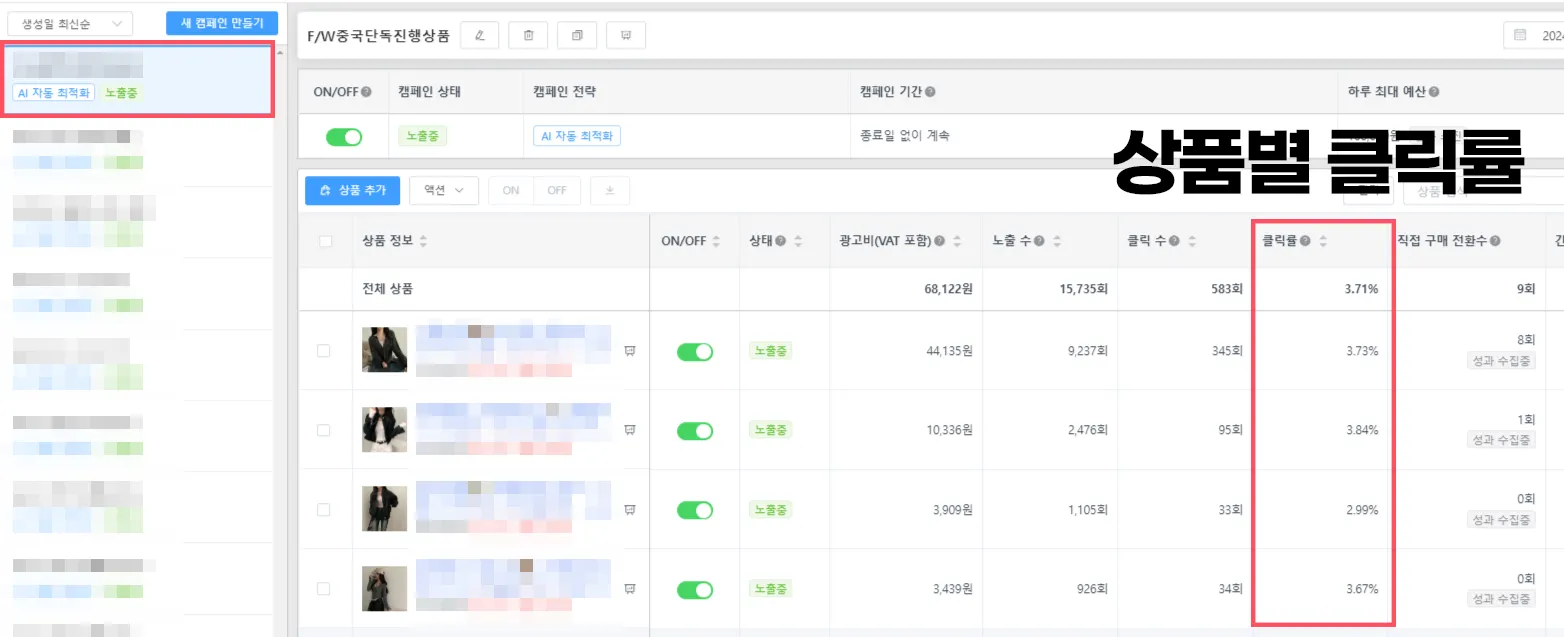 캠페인 관리 - 특정 캠페인 클릭 시 클릭률 등 상품별 광고 성과를 확인할 수 있습니다.