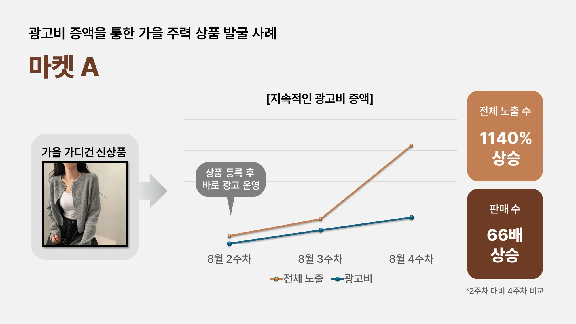 마켓 A는 8월 2주차 미리 가을 신상품을 업로드한 뒤 바로 광고 운영하였고, 주차별로 광고비를 2배 이상 증액했습니다.