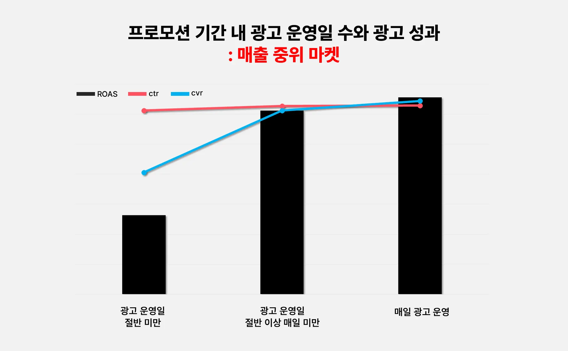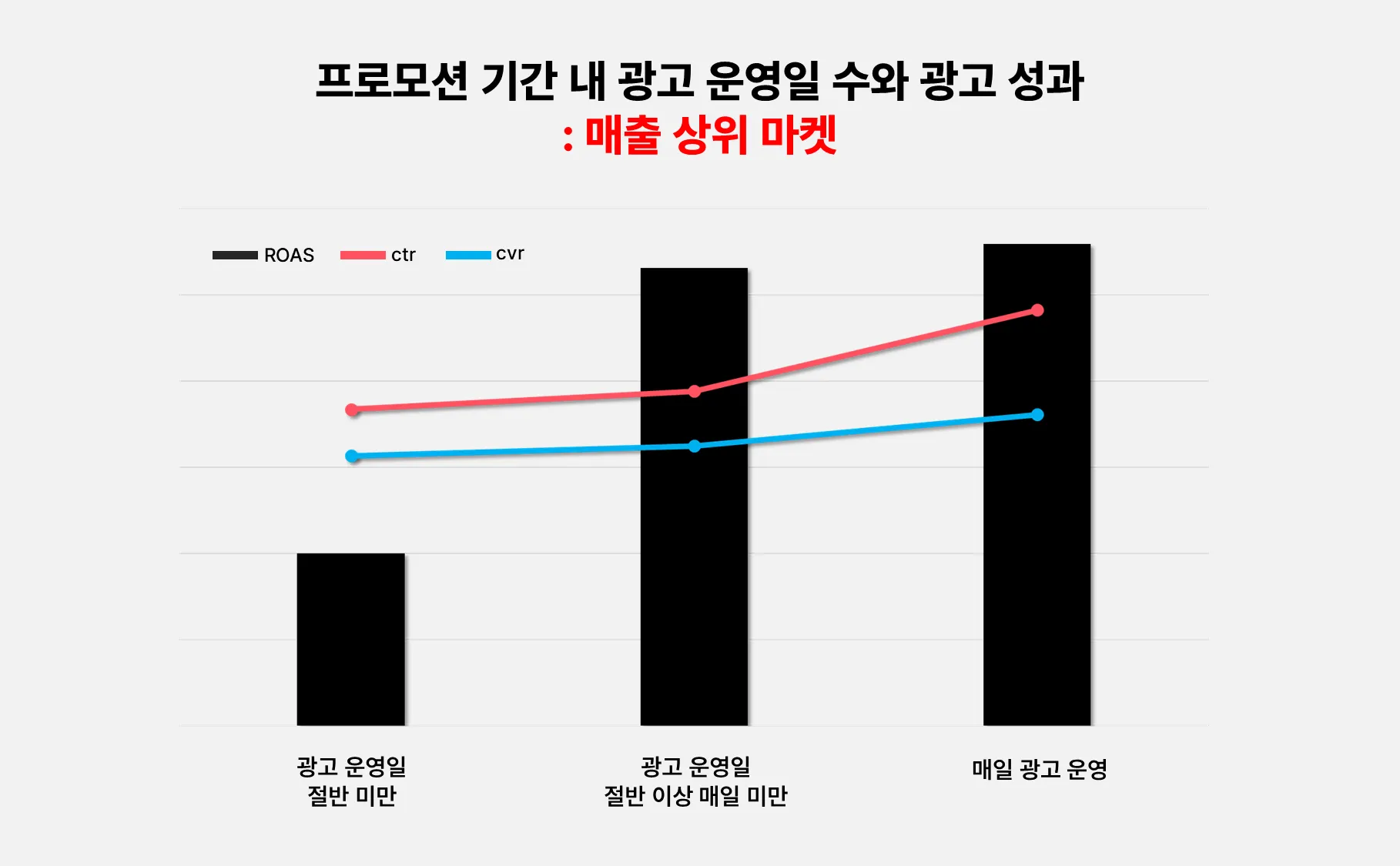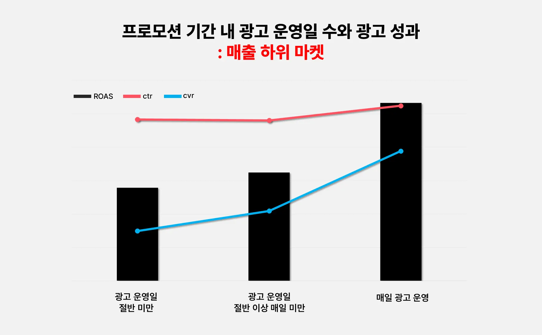 특히 구매 전환 지표에 많은 영향을 주게 되어, 매일 광고를 운영하는 마켓은 광고를 절반도 운영하지 않는 마켓에 비해 2.61배 더 높은 ROAS, 1.91배 더 높은 cvr을 보유하고 있습니다.