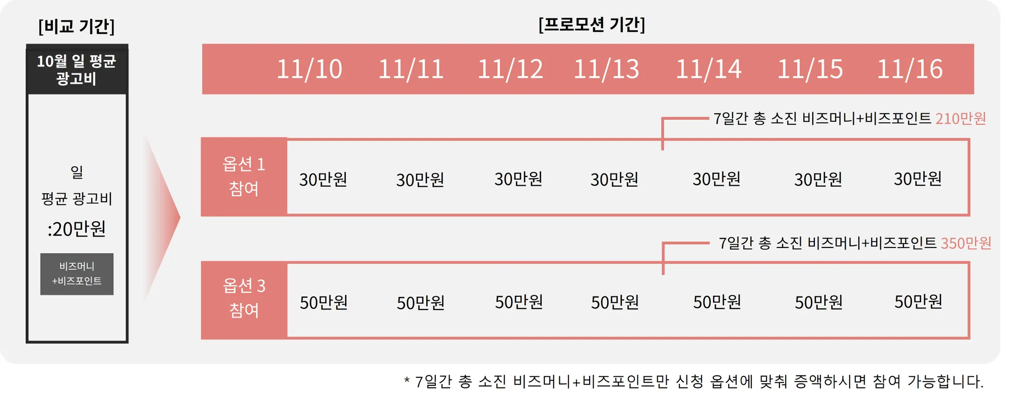 프로모션 기간 동안 선택하신 조건의 광고비(비즈머니+비즈포인트) 소진이 필수입니다.