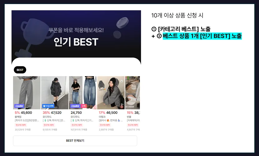 신청 상품 중 베스트 상품 1개 [인기 BEST] 가로형 진열 구좌에 추가 노출