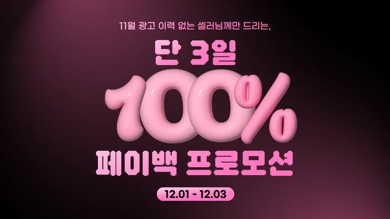 기 공지드린 블랙프라이데이 라스트 70% 페이백 프로모션과 함께 11월 광고 이력이 없는 마켓 대상으로는 100% 페이백 프로모션을 진행합니다. 프로모션 기간은 70% 페이백 프로모션과 동일하며, 대행사별 대상 리스트 함께 전달드립니다.