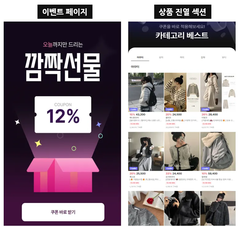 프로모션 신청 시, F/W 베스트와 깜짝 쿠폰 1차/2차까지 총 12일간 3개의 기획전 페이지에 노출됩니다.