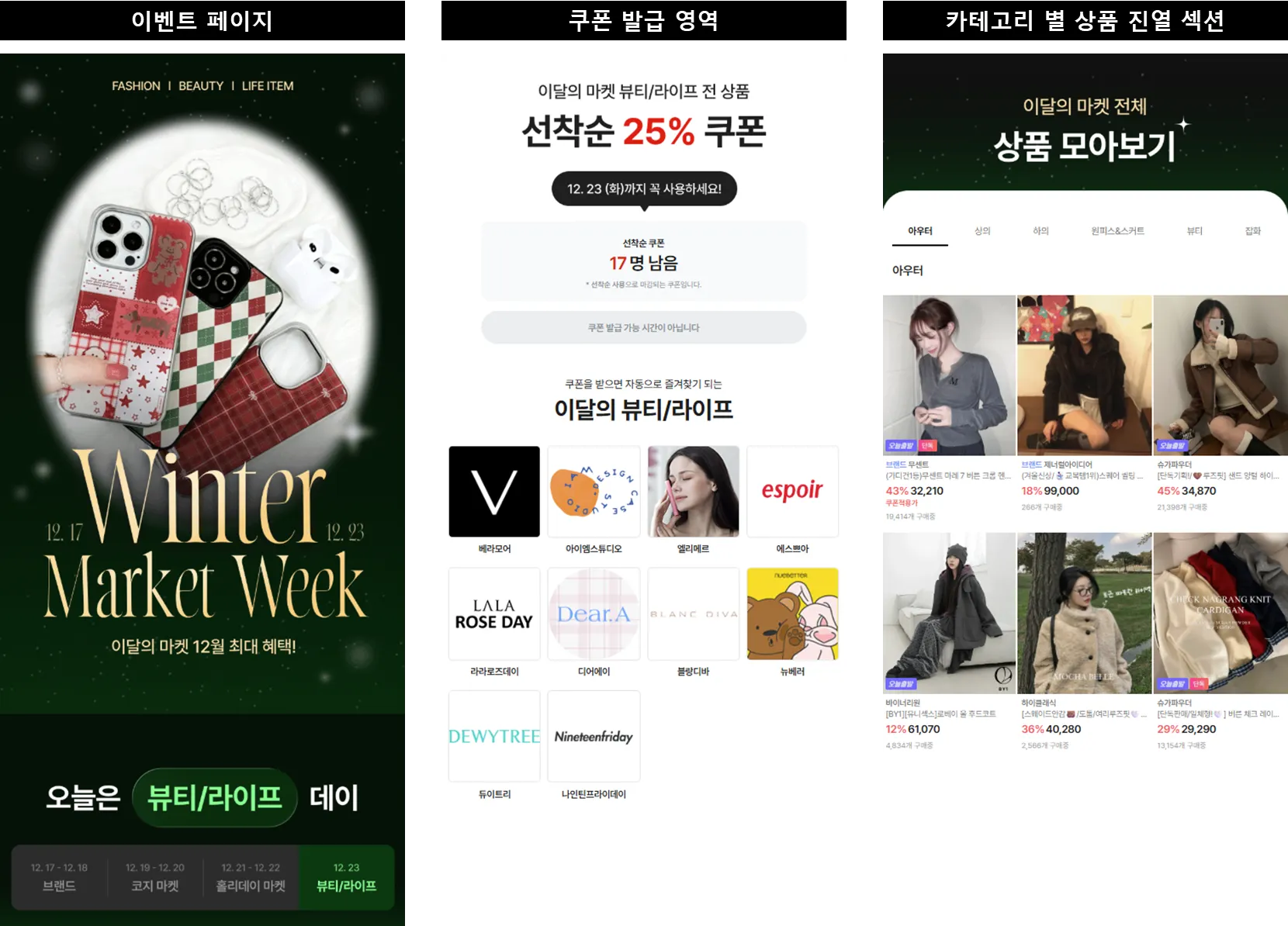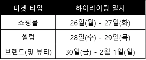*) 각 마켓 타입별(쇼핑몰, 셀럽, 브랜드) 하이라이팅 일자를 지정하여 모든 마켓 타입이 충분한 노출을 받을 수 있도록 구성했습니다.
