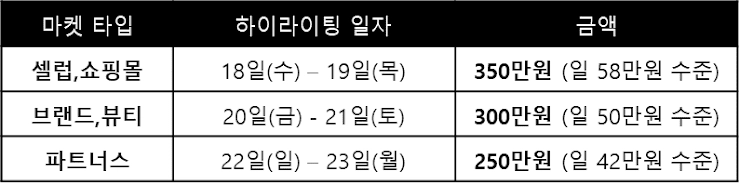 *) 각 마켓 타입별 하이라이팅 일자를 지정하여 모든 마켓 타입이 충분한 노출을 받을 수 있도록 구성했습니다.