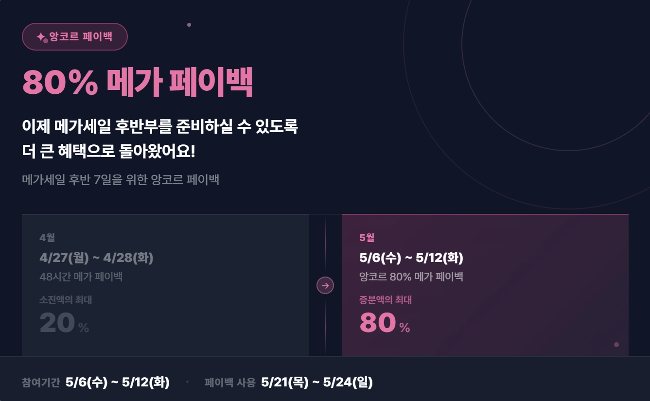 특히 이번 프로모션은 메가세일 후반 7일간, 지금까지 한 번도 진행한 적 없는 최초 80% 페이백 혜택으로 준비했습니다.
