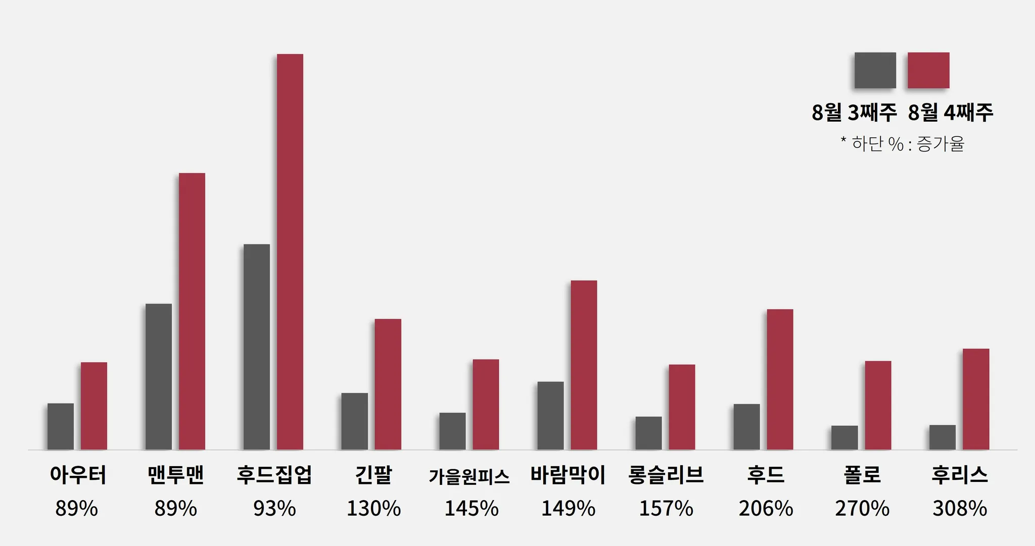 올해도 작년과 같은 추세가 이어질까요? 8월 3째주와 4째주를 비교하여, 에이블리에 최근 급상승 하고 있는 검색어는 무엇인지 확인해보았습니다.