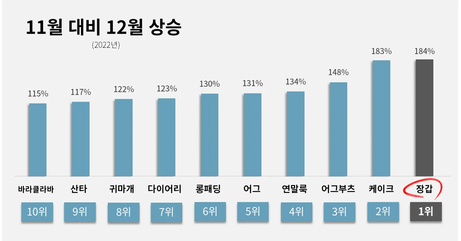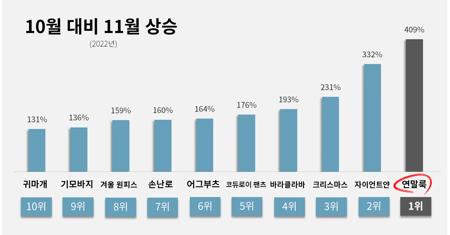 가을에서 겨울로 급격히 전환되는 시점에서 가장 빠르게 조회수가 상승했던 검색어를 11월과 12월로 나누어 정리해보았습니다.