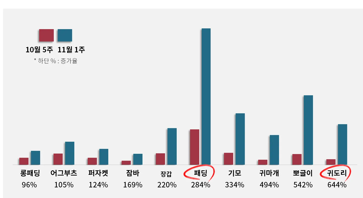 올해도 작년과 같은 추세가 이어질까요? 10월 5째주와 11월 1째주를 비교하여, 에이블리에 최근 급상승 하고 있는 검색어는 무엇인지 확인해보았습니다.