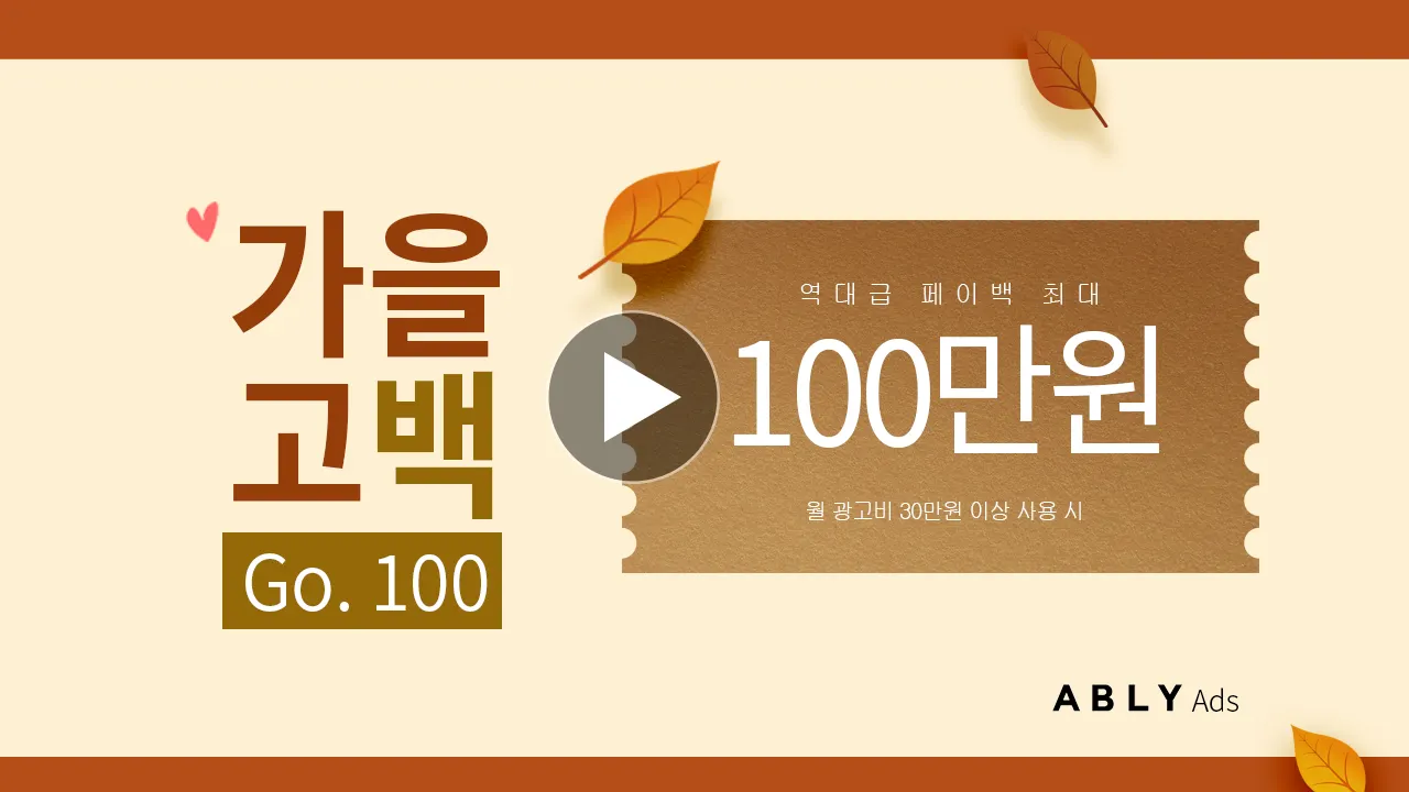 성수기인 가을 준비에 ‘진심’이신 광고주님들을 지원하고자 에이블리가 야심차게 준비한 “가을고백 (Go 100) 프로모션” 소개합니다. 누구나 참여 가능한 대규모 프로모션 “가을고백”을 통해 에이블리와 함께 성장해보아요!