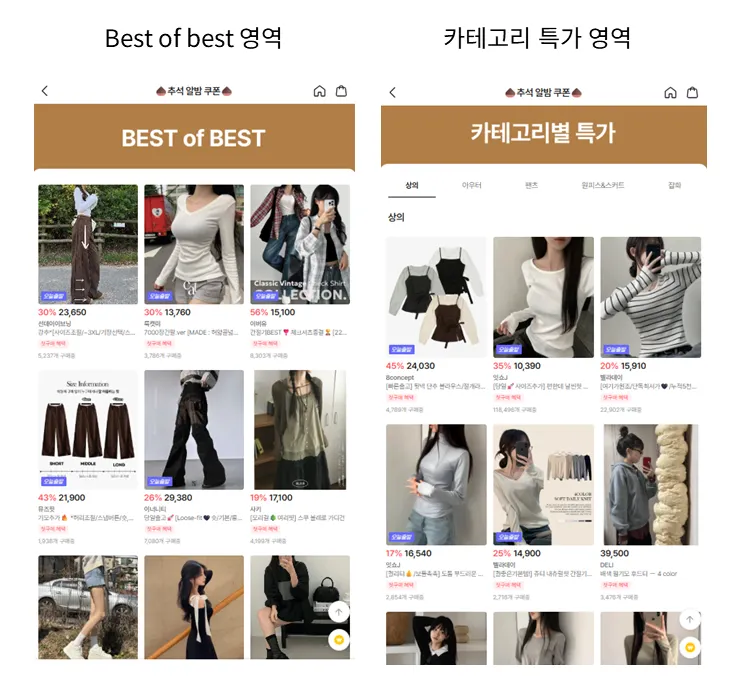 1) Best of Best 영역 : 신청 상품 수가 많은 셀러님의 상품이 진열됩니다.