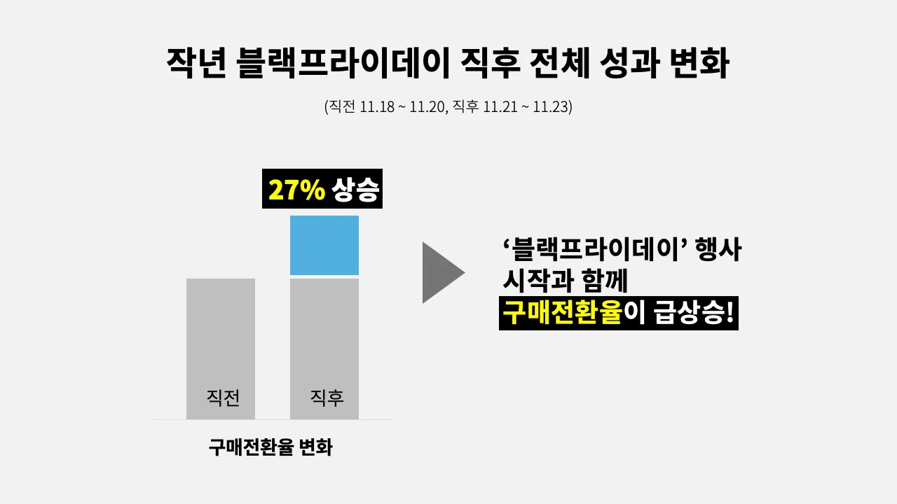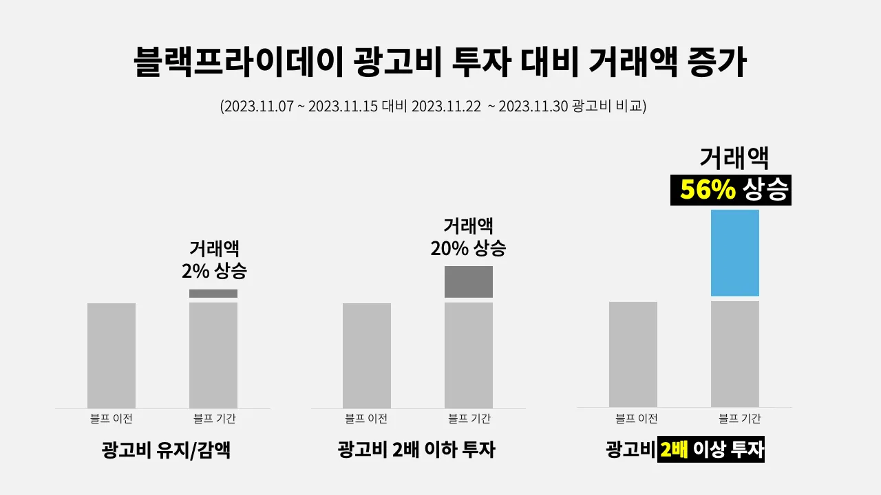 2023년 블랙프라이데이 기간 월 초 일 평균 광고비의 2배 이상 증액한 마켓은 거래액이 56% 상승한 반면, 광고비를 늘리지 않은 마켓은 노출 경쟁이 치열해지는 전사 행사 시기에 충분한 노출량을 확보하지 못했기 때문에 거래액이 크게 성장하지 못했습니다.