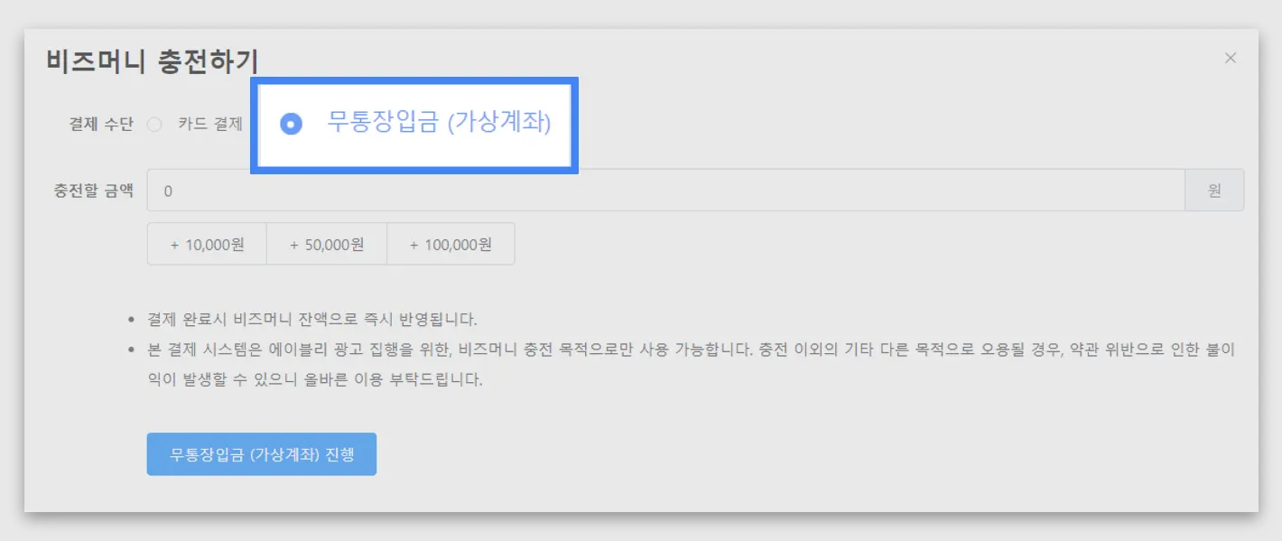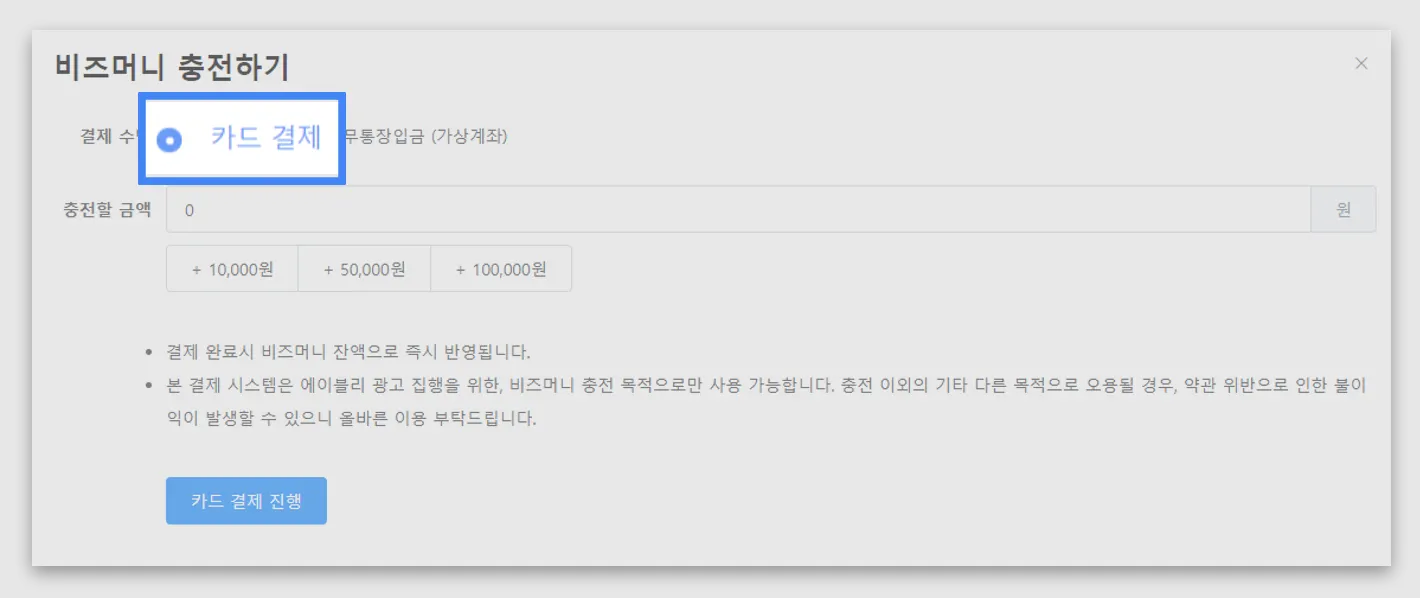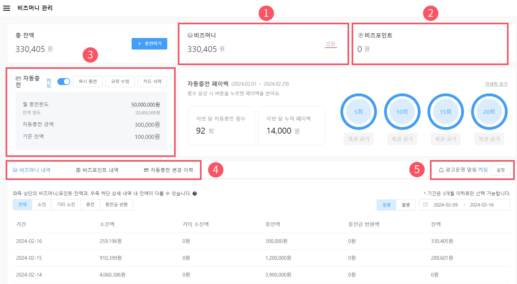 대시보드 기능들이 잘 정리되셨나요? 이제 본격적으로 비즈머니를 충전해보도록 하겠습니다.