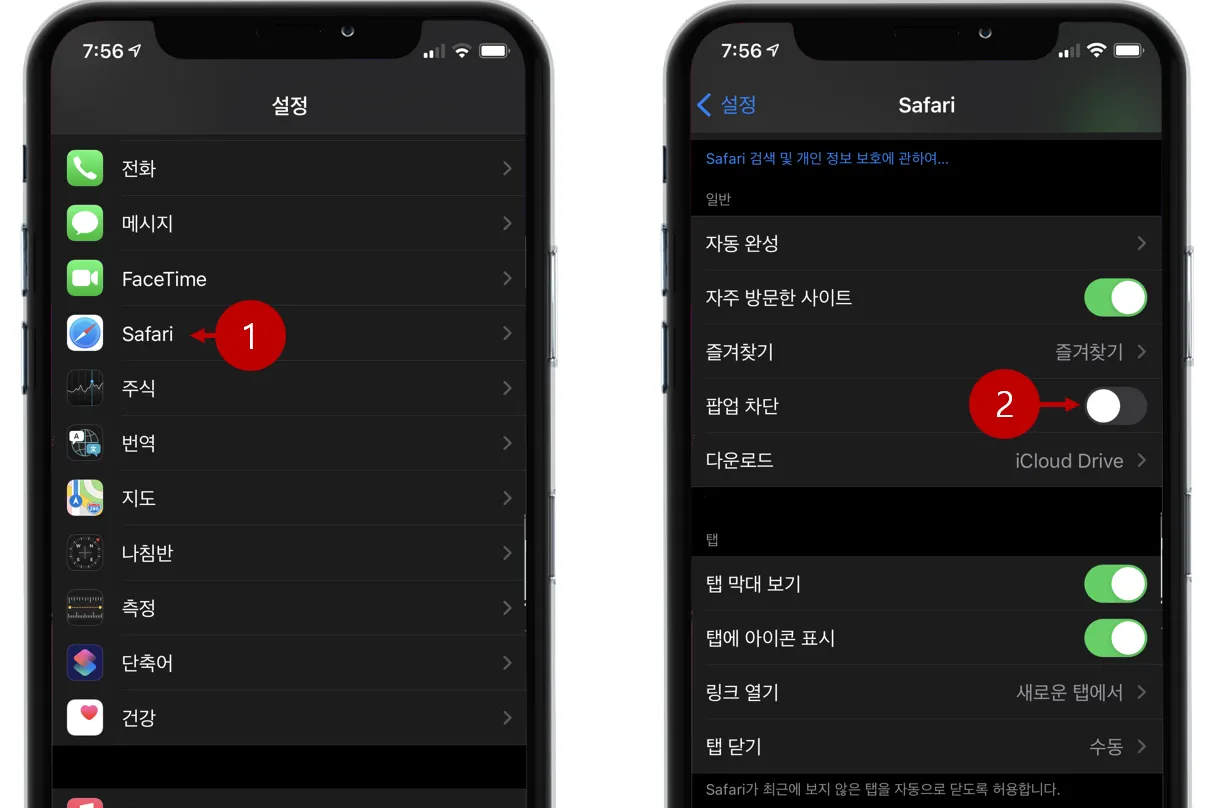이럴 땐, 아이폰 설정에 들어가서 Safari를 눌러주신 뒤 팝업 차단을 비활성화 해주시면,