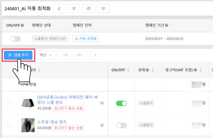 캠페인명 클릭 - 캠페인 상세 화면에서 - 상품 추가 버튼 클릭