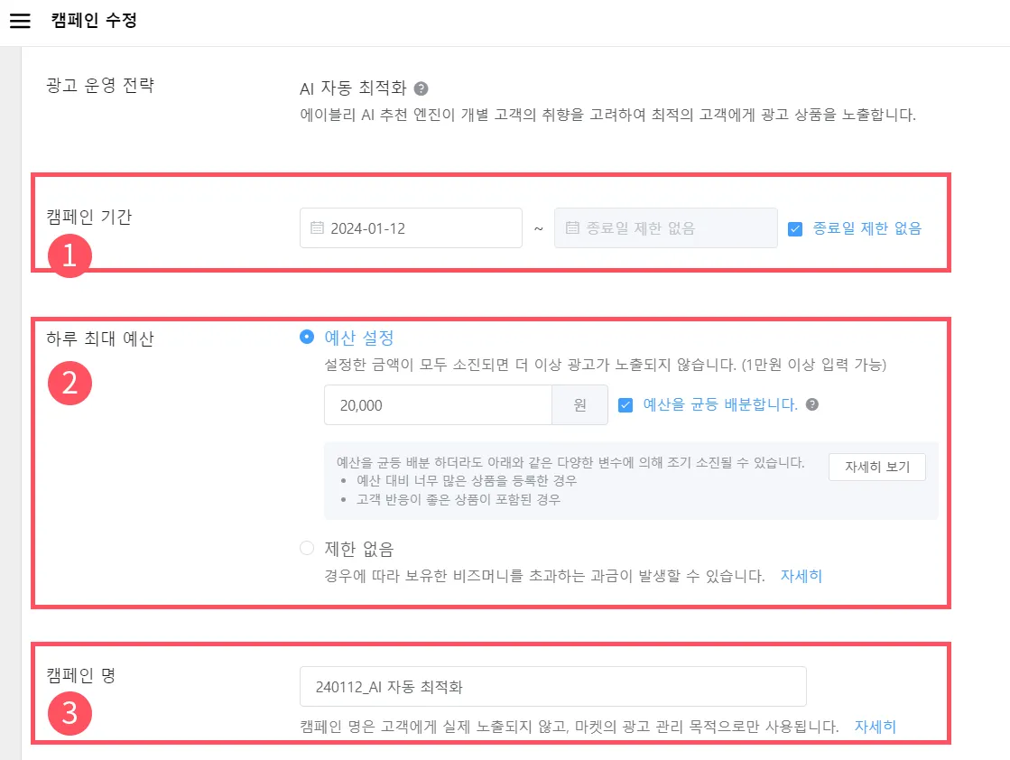 캠페인 기간, 하루 최대 예산, 캠페인 명의 수정이 가능합니다.