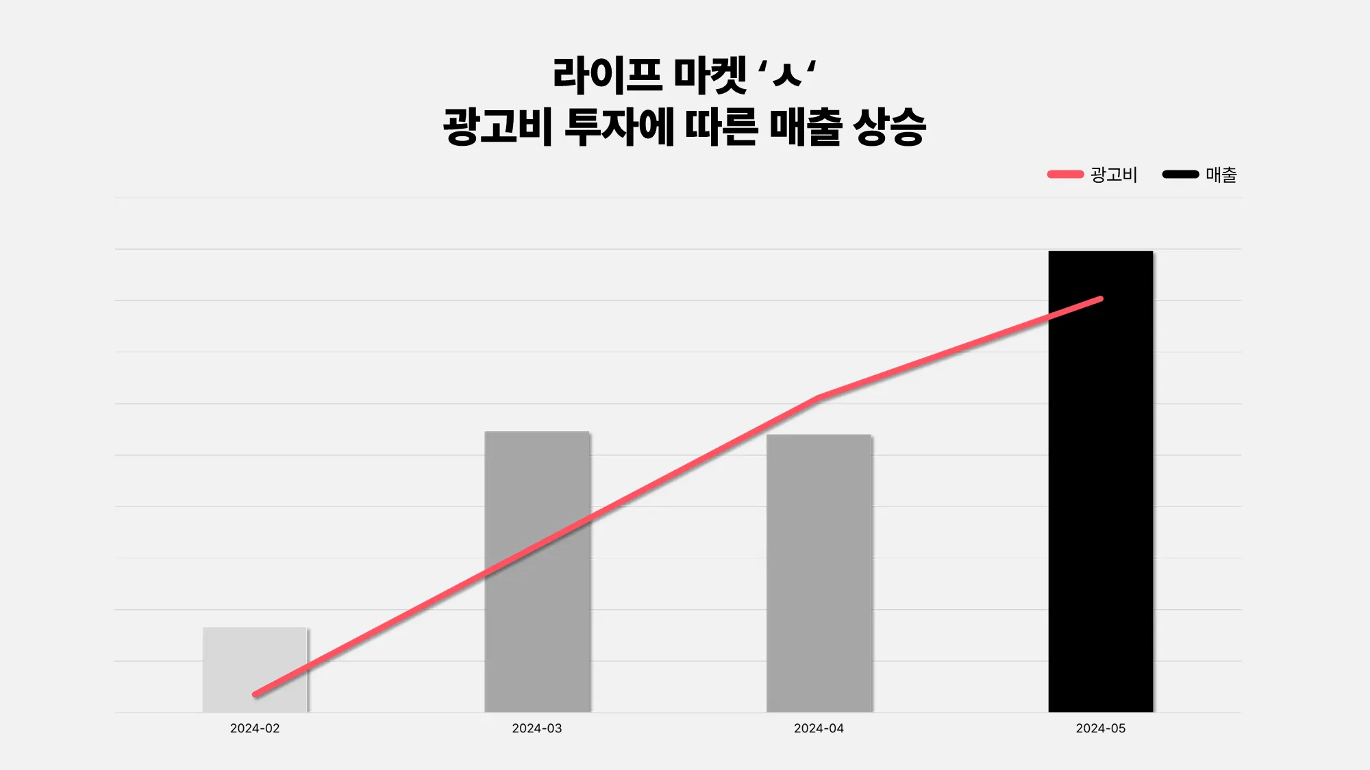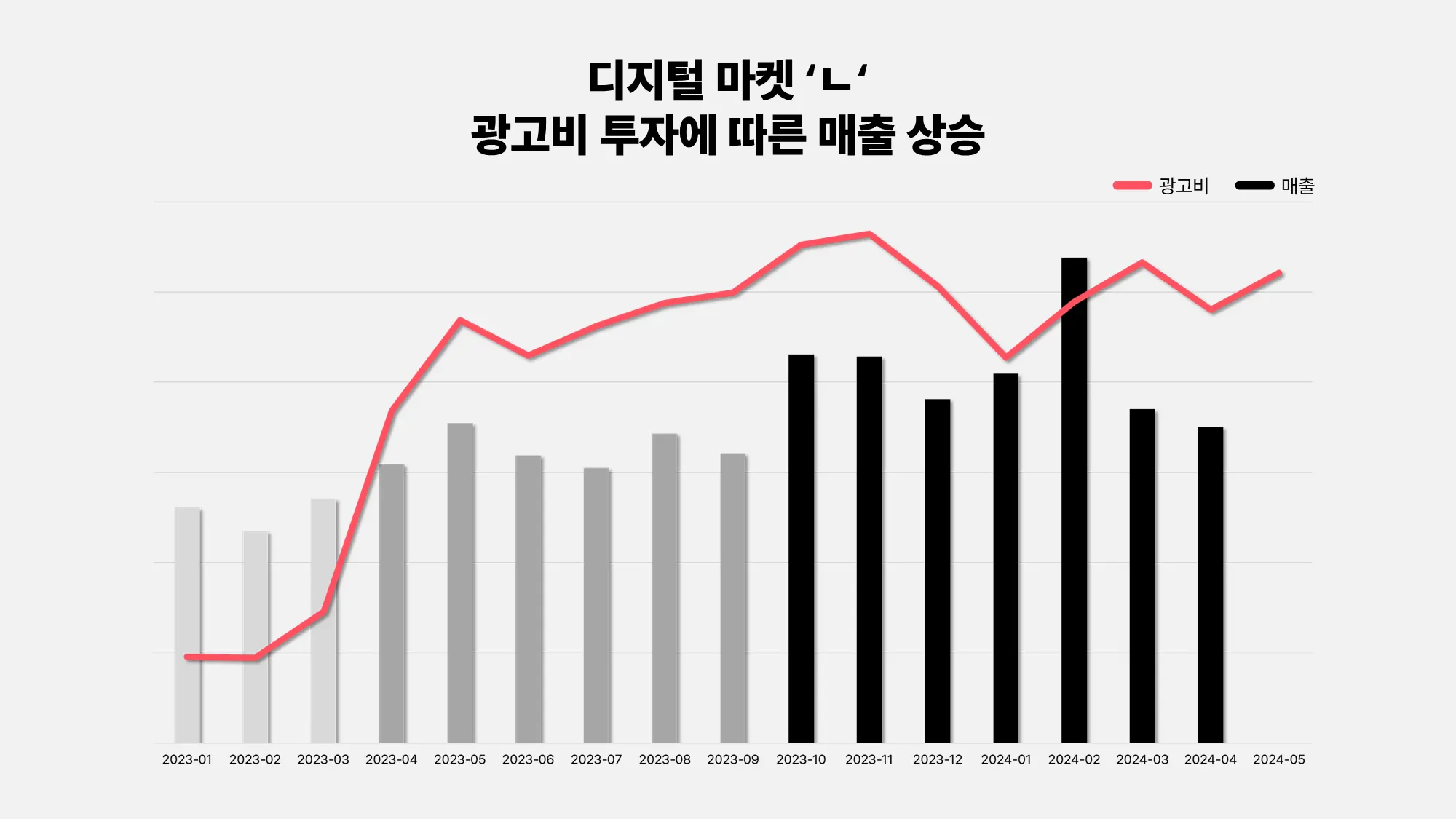 광고 시작 이후 매출이 놀랍게 성장하며 “광고를 통한 노출량 증가는 잠재적 고객 확보의 핵심”임을 경험한 뒤 꾸준히 광고비를 증액하여, 24년 5월에는 작년 동기 대비해서 5배 넘는 매출을 기록했습니다