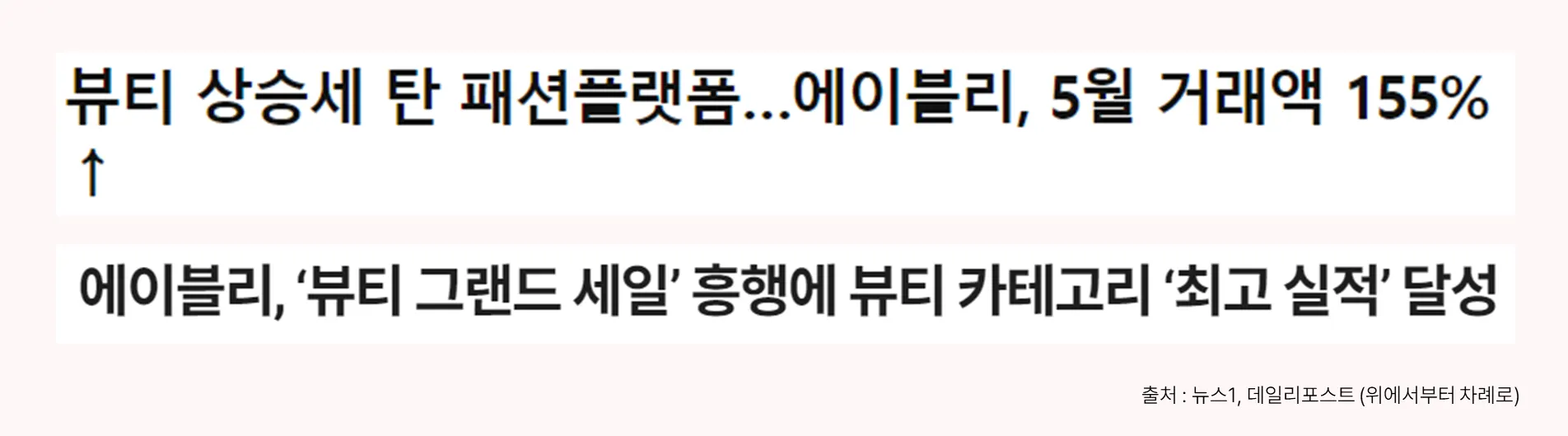 에이블리 뷰티는 오픈마켓/플랫폼에서는 보기 드문 뷰티 정기 행사인 ‘뷰티 그랜드 세일’과 뷰티 단독 상품인 ‘온리 에이블리(ONLY ABLY)’를 중심으로 성장 상승세를 제대로 탔는데요!