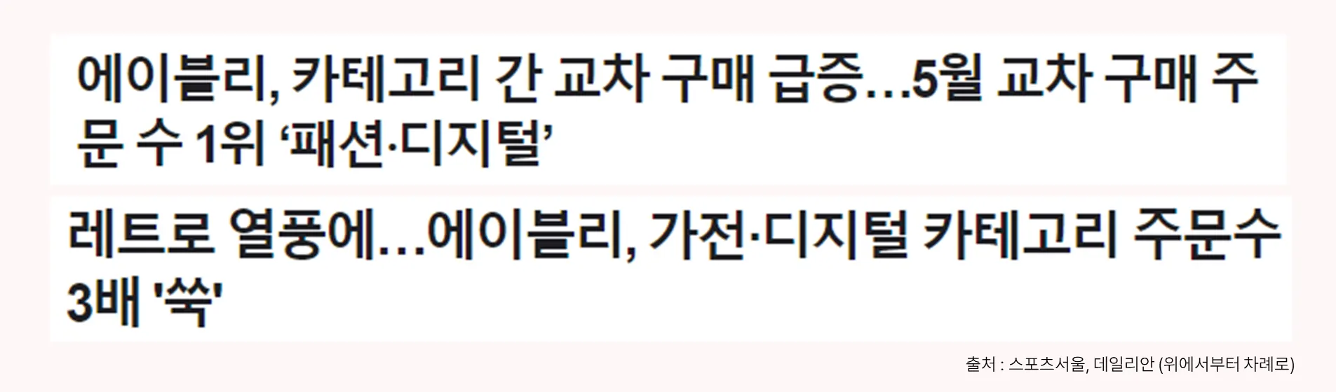 디지털 카테고리는 패션과 교차 구매가 가장 많이 발생하는 카테고리인 만큼, 에이블리의 성장세가 가장 빠르게 반영되는 카테고리인데요!