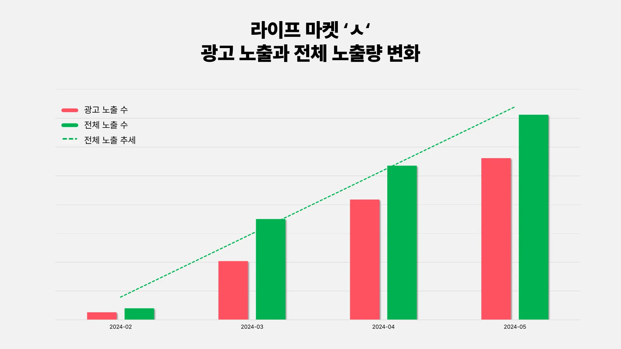 광고를 시작한 23년 7월, 광고 노출에 힘입어 전체 노출량이 크게 증가하였고, 이후 광고 노출이 증가하며 노출 최적화를 위한 데이터가 더 많이 쌓였고, 전체 노출량 또한 지속적으로 증가하게 됩니다.