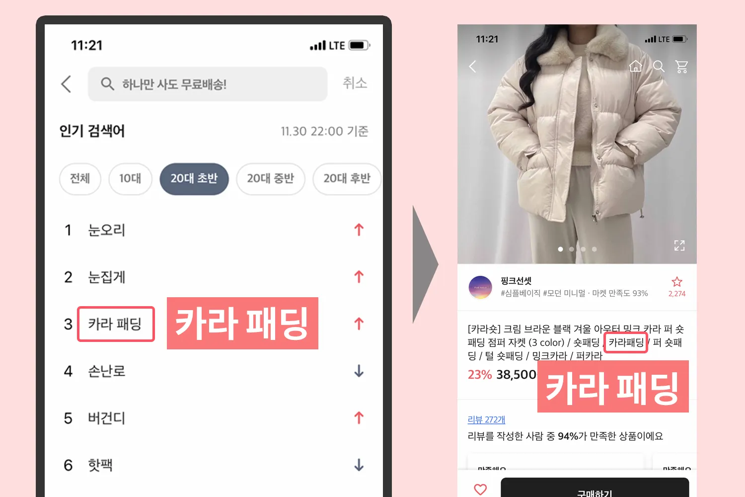 특정 시기에 자주 찾는 키워드가 상품명에 포함되는 경우 클릭 가능성이 높아집니다.