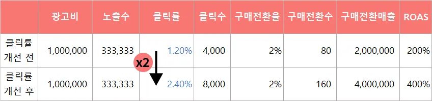 클릭률을 2배로 높이면, 유입 고객수(클릭수)가 2배 늘어나고 매출도 2배로 늘어나게 되는 것입니다.
