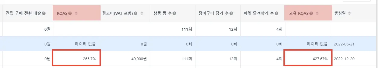 ROAS와 고유 ROAS 간 차이가 발생하는 경우 → 캠페인 내 광고비만 나가고 구매전환이 0인 상품이 존재한다는 뜻입니다. 즉시 상품별 광고 성과를 확인하여, 저효율 상품을 확인해주세요!