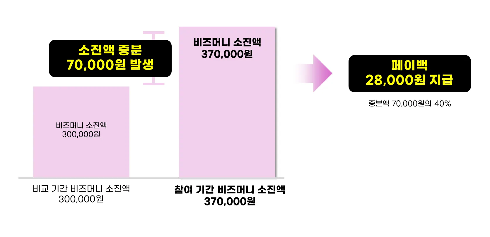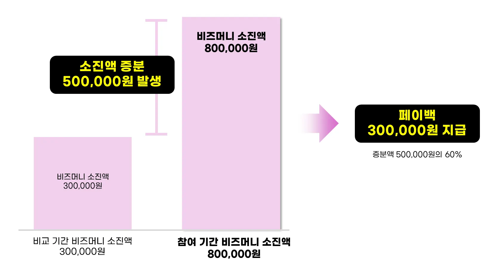 비교 기간 비즈머니 소진액 대비 참여 기간 비즈머니 기준 8만원 이상 더 소진 시 소진액 증분의 60% 페이백