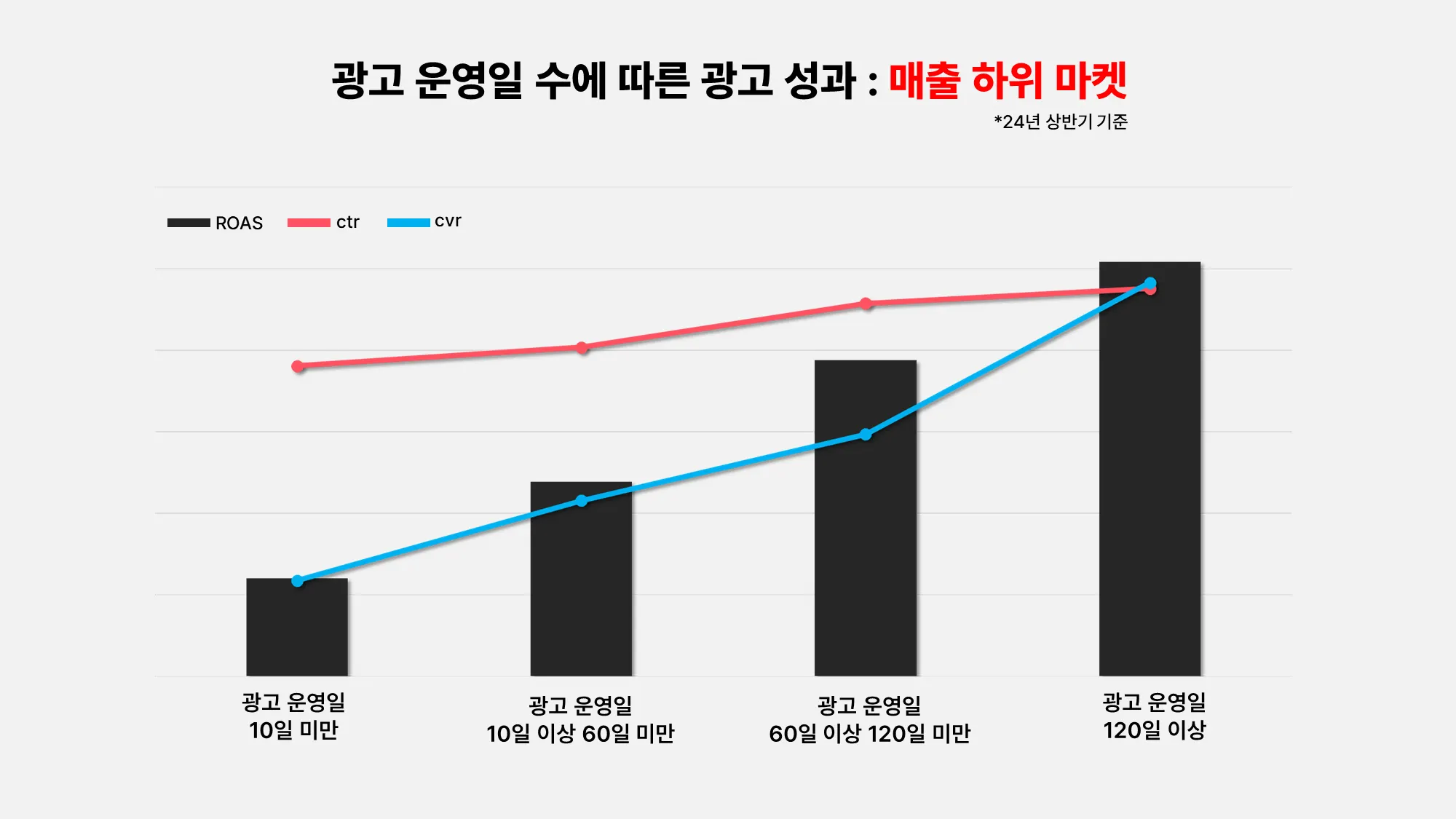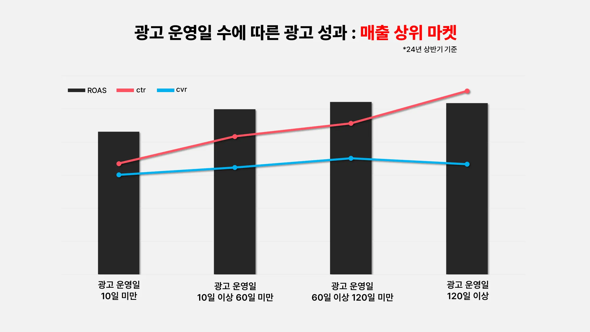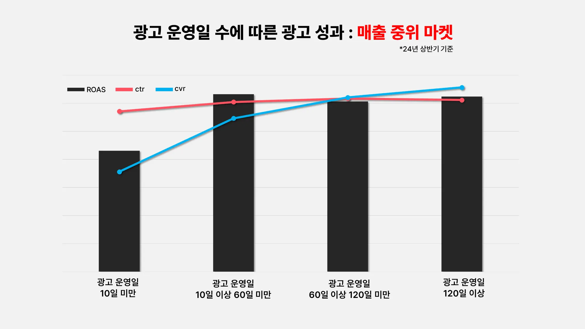 실제로 24년 상반기 동안 광고를 120일 이상 꾸준히 운영한 매출 중상위 마켓은 10일도 채 운영하지 않은 동일 규모 마켓보다 평균 65% 높은 구매 전환율, 42% 높은 ROAS 수치를 기록하고 있어요!