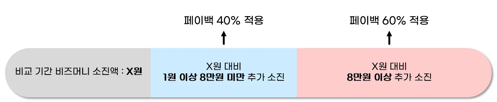 비교 기간 비즈머니 소진액 대비 참여 기간 비즈머니 기준 1원 이상 8만원 미만 더 소진 시 소진액 증분의 40% 페이백