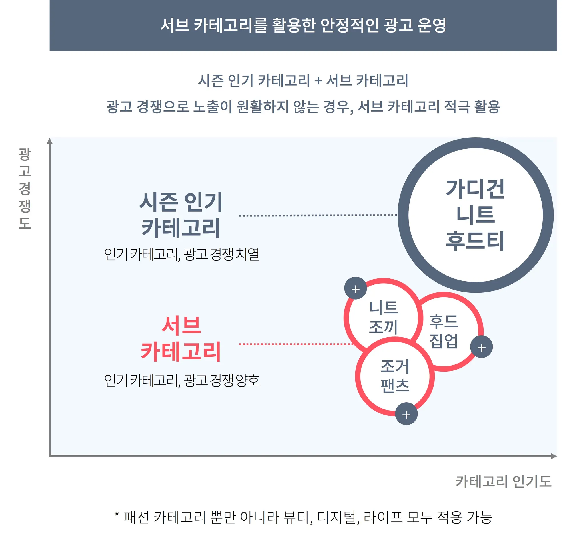 가을이 시작되면서 에이블리 고객님들이 가장 많이 찾는 ‘가디건’, ‘니트’, ‘후드티’ 등의 인기 카테고리는 광고 경쟁 또한 높아 생각만큼 광고 노출이 되지 않는 경우가 발생할 수 있습니다. 이처럼 특정 카테고리에 너무 편중되어 광고를 운영할 경우 노출이 원활하지 않을 수 있기 때문에, 가능하면 핵심 타겟 카테고리와 더불어 서브 카테고리의 상품을 병행하여 광고를 운영하는 것이 좋습니다.