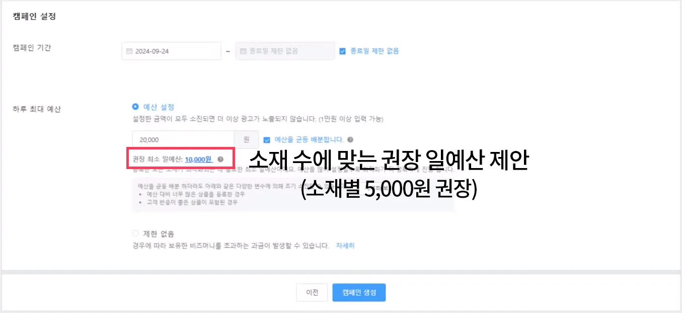 Step4. 캠페인 기간 / 예산 설정 (기존 등록 방식과 동일)