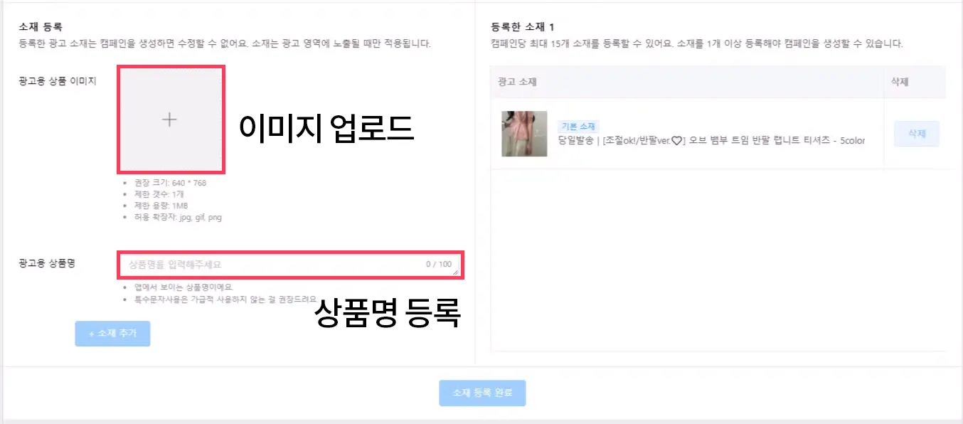 * 광고 소재를 최소 1개 이상 등록해야 하며, 최대 15개까지 등록이 가능합니다.