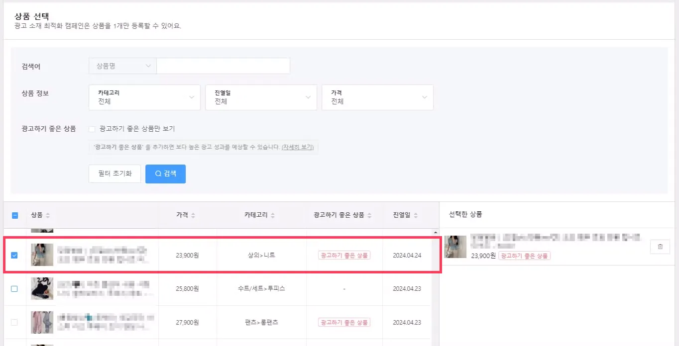 캠페인에 하나의 광고 상품을 선택 후, 여러 소재(이미지+상품명)를 등록하여, 광고를 운영합니다.