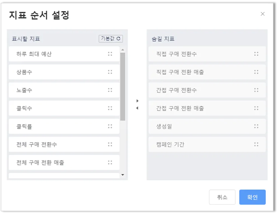 기본적으로 숨겨진 지표 : 직접 구매 전환수, 직접 구매 전환 매출, 간접 구매 전환수, 간접 구매 전환 매출, 생성일, 캠페인 기간