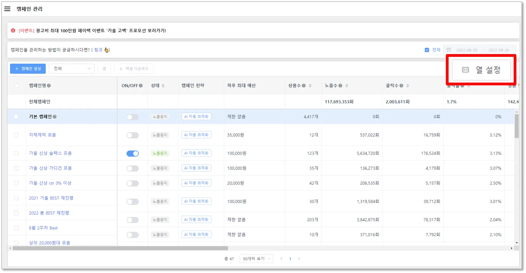[캠페인 관리] 클릭 후 우측의 ‘열 설정’ 버튼을 클릭해서 표시되는 지표들을 확인해주세요!
