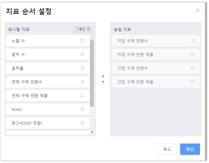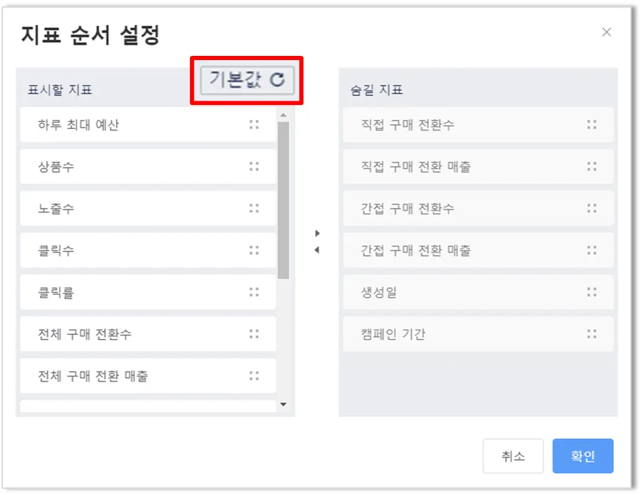 만약 설정한 지표와 순서를 다시 초기화하고 싶으시다면, ‘기본값’ 버튼을 클릭해주시면 기본 설정으로 돌아갑니다!