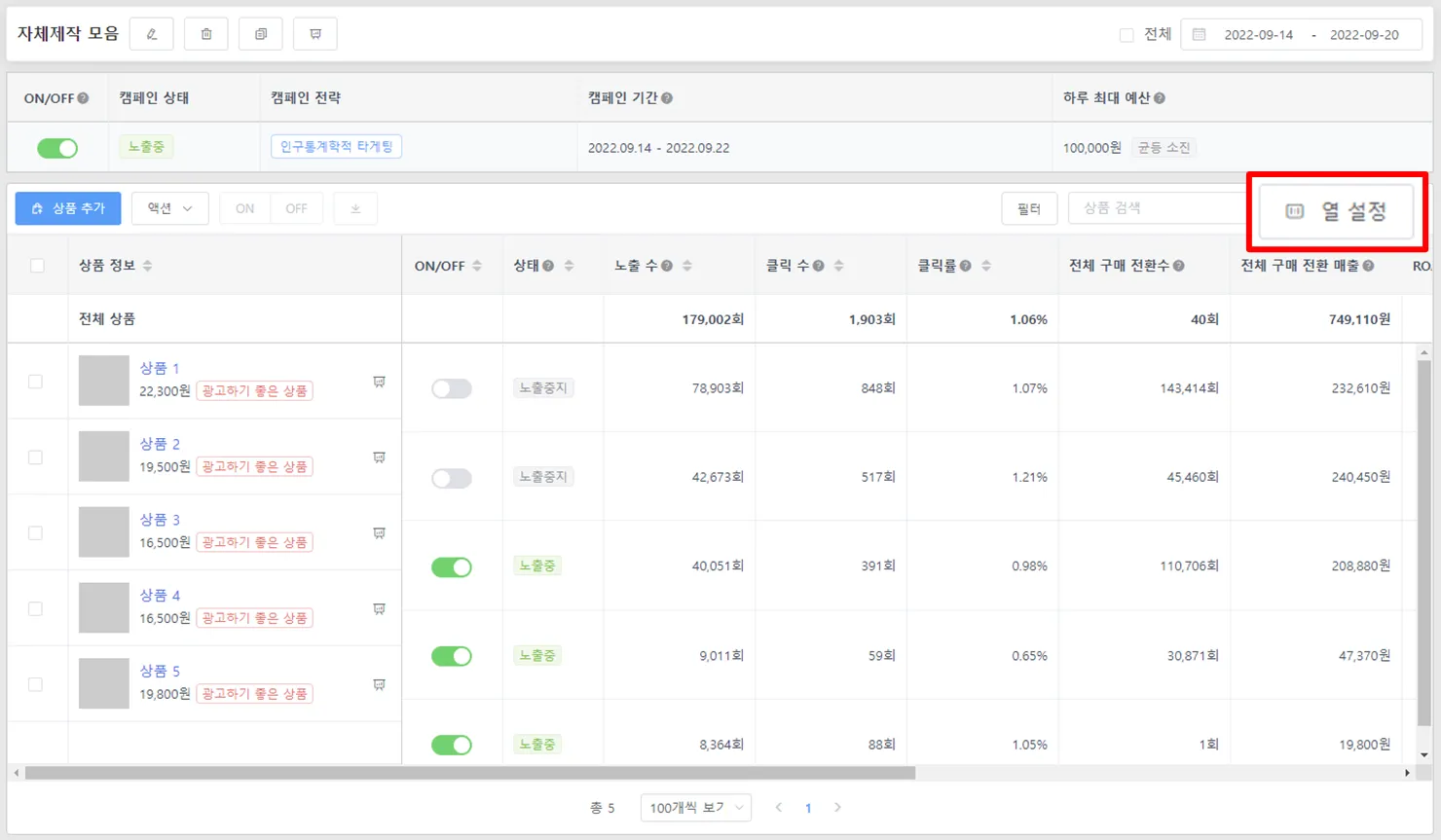 STEP 2. 캠페인 내 상품 성과 테이블에서 보고 싶은 지표 정하기