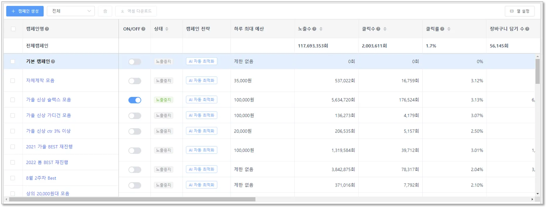 맞춤이 불가능한 지표 : 캠페인명, ON/OFF, 상태, 캠페인 전략, 하루 최대 예산