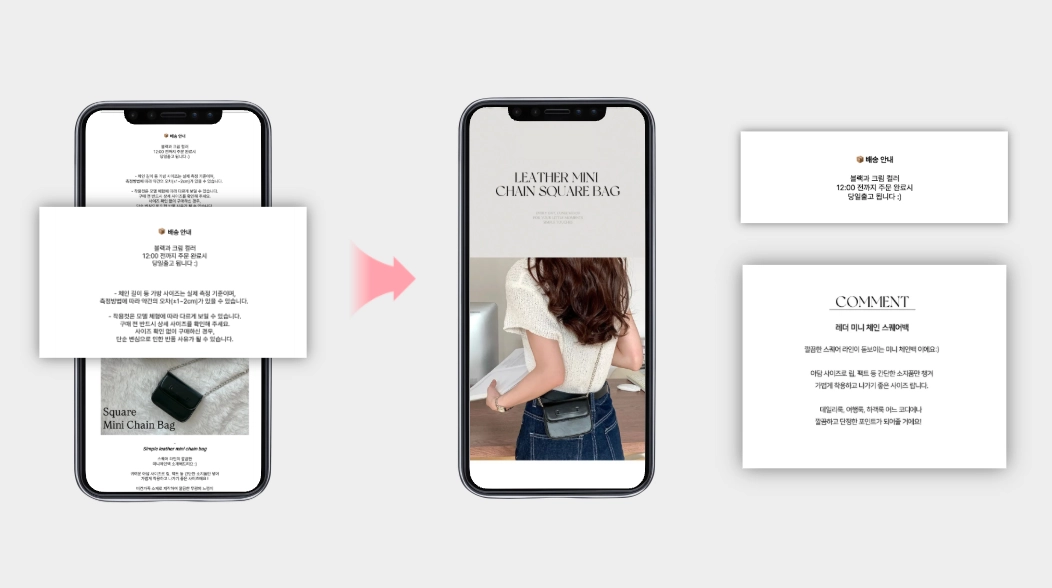 첫 스크롤부터 배송 지연 공지, 장문의 텍스트가 확인되면 유저는 거부감을 느낄 수 있어요. 상세페이지의 ‘첫 인지 영역’에는 상품에 대한 직관적인 이미지를 바로 제시해서, 유저들이 상세페이지 스크롤을 끝까지 내려 길게 체류할 수 있도록 유도해주세요.