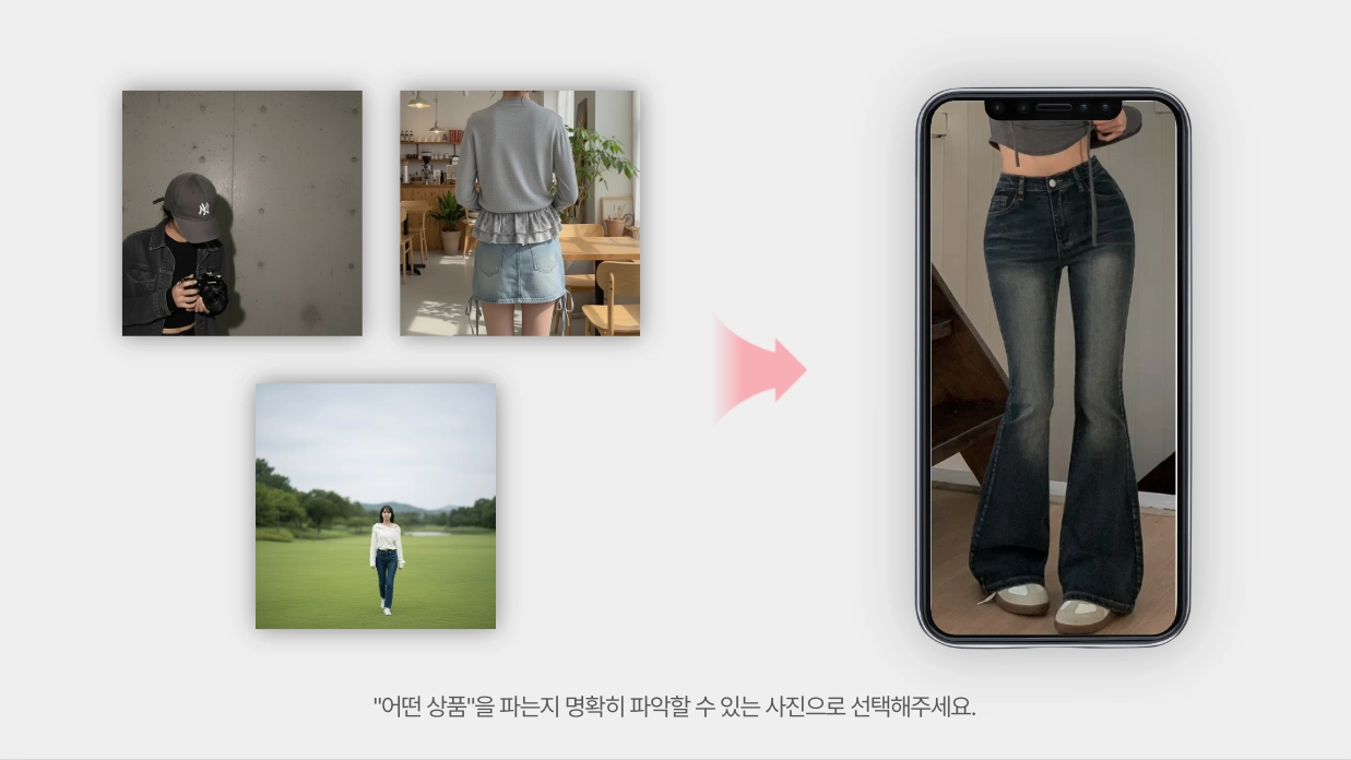 상품보다 배경, 모델, 분위기, 함께 착용한 다른 상품에 먼저 눈길이 가면, 유저들은 “그래서 무슨 상품을 파는지” 파악할 수 없어요. 판매하고자 하는 상품을 유저들에게 잘 알려주는게 필요해요.