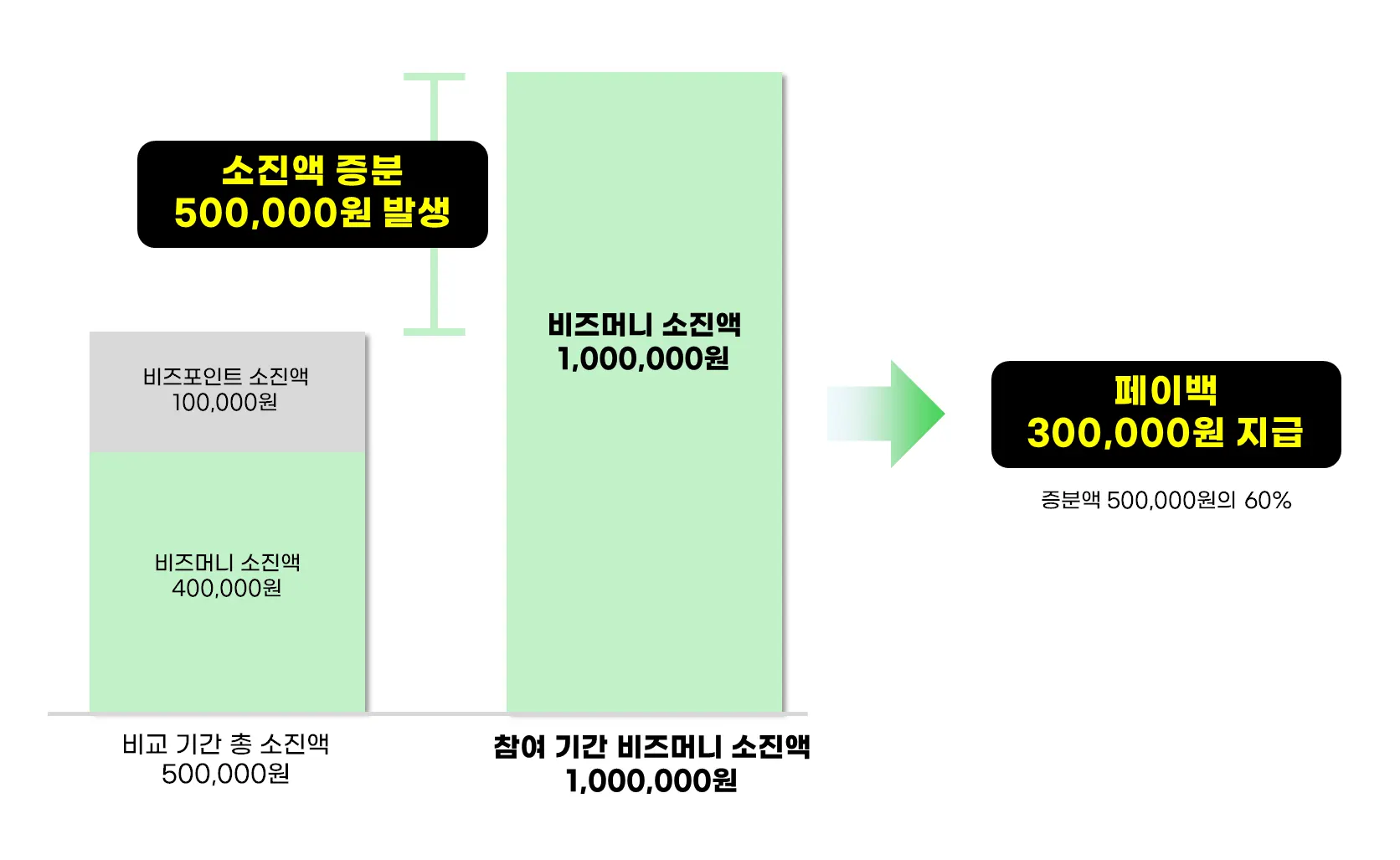 비교 기간 총 소진액 (비즈머니 + 비즈포인트) 대비 참여 기간 비즈머니 기준 10만원 이상 더 소진 시 소진액 증분의 60% 페이백
