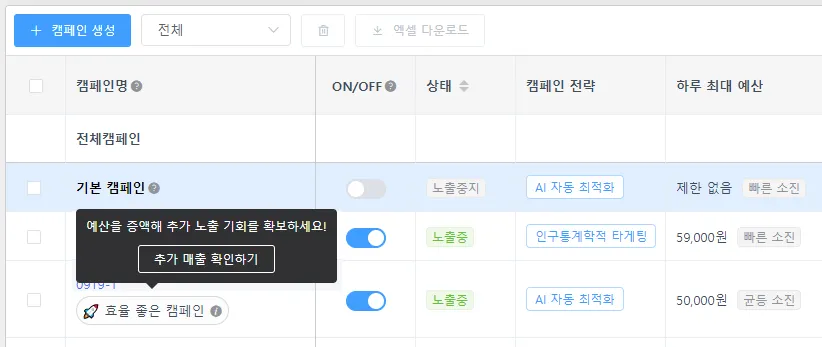 ‘효율 좋은 캠페인’ 마우스 오버 시 보이는 ‘증액하기’ 버튼을 클릭하세요.