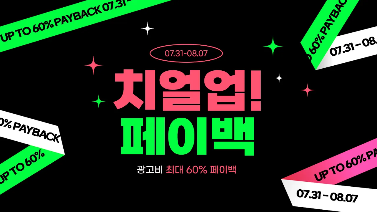 광고비 최대 60%를 금액 제한 없이 페이백해드리는, ‘치얼업! 페이백’ 프로모션이 진행 중입니다!